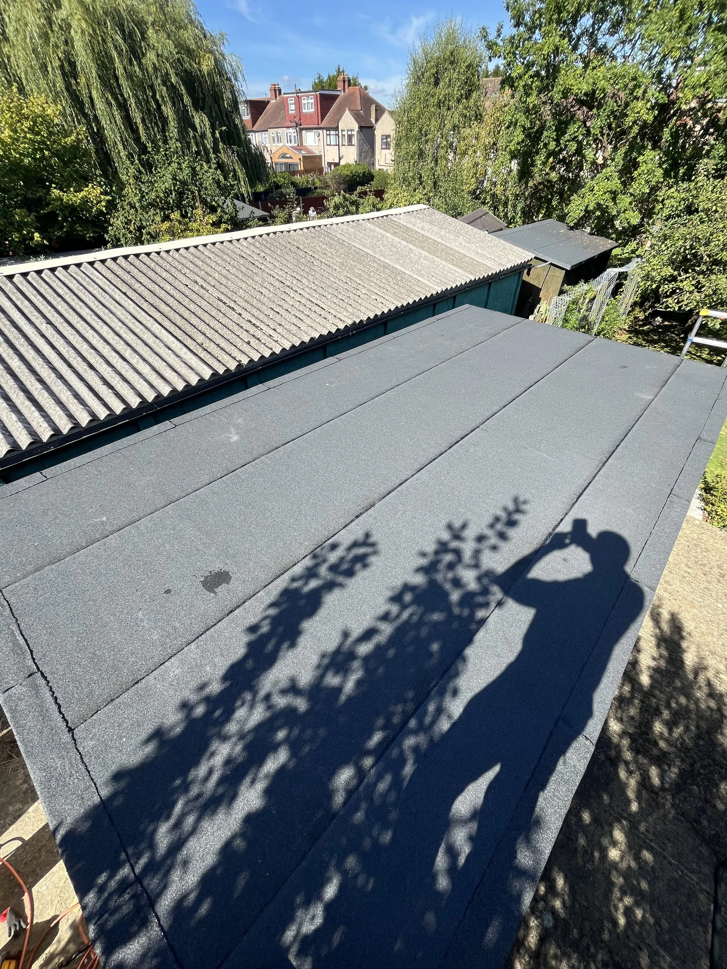 After the old felt roof had significantly deteriorated, leaving this garage in an urgent state of repair and in need of immediate attention, we stripped away the old felt entirely and then installed a new three-layer built-up felt roof. To enhance the overall appearance and functionality, we also fitted brand new black UPVC fascias and gutters that provide a maintenance free finish.