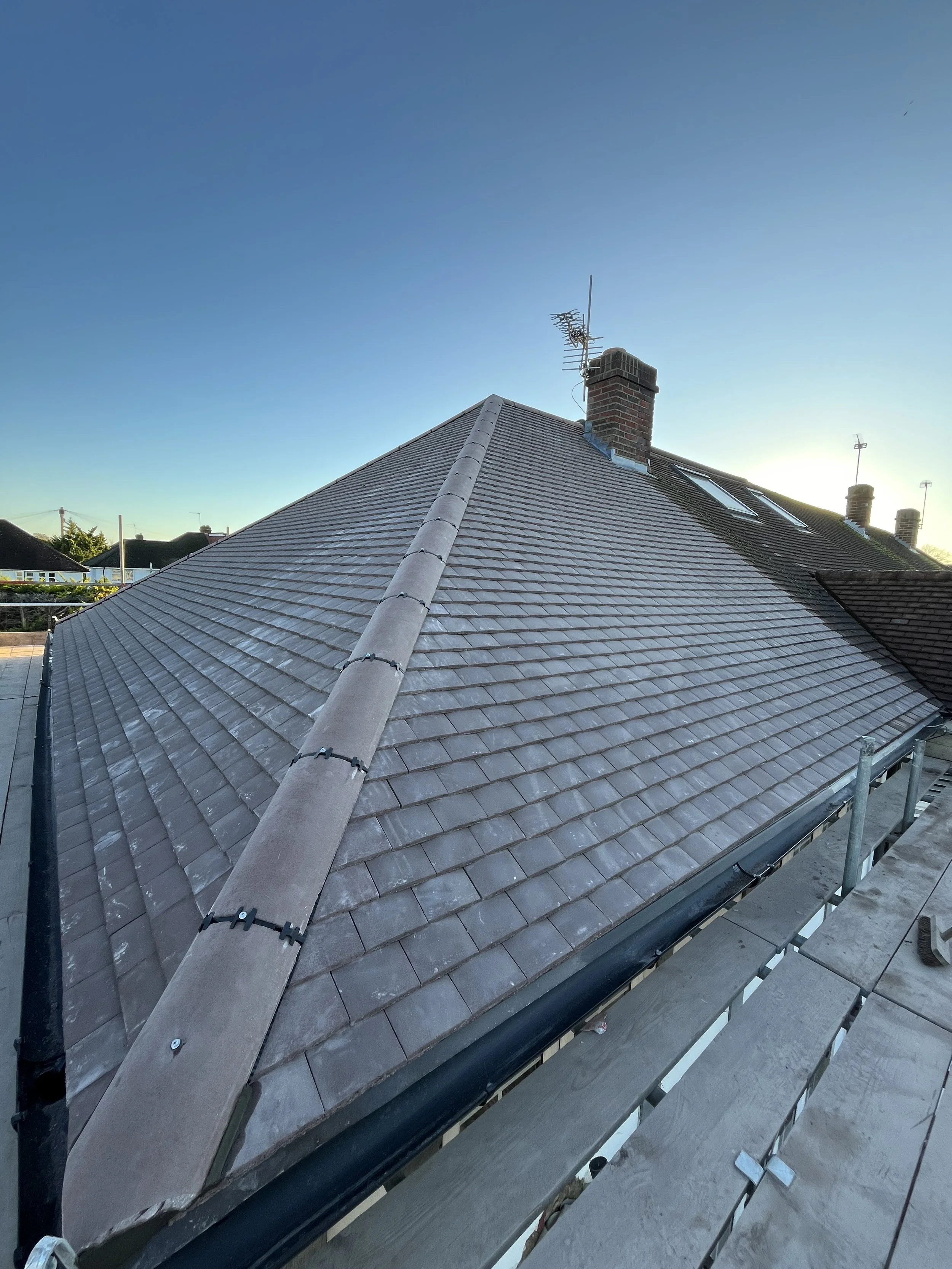 After this roof had reached the end of its lifespan we advised it was best to renew everything above gutter level. a new roof complete with breathable membrane, batten and new tiles was installed, along with a dry ridge kit.